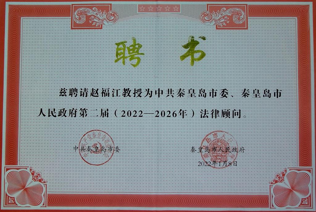 建立法律顾问制度,是市委市政府贯彻落实习近平法治思想和全面依法治国方略,深入推进依法行政和法治秦皇岛建设工作的一项重要内容。作为10名受聘专家之一,赵福江教授表示这既是一种荣誉,更是一份责任,将充分发挥自身的法律专业知识优势,充分发挥政府法律顾问的前哨作用、智库作用,为秦皇岛市委市政府各项制度的建设和完善提供优质的法律意见和法律服务,为秦皇岛市的法治现代化建设贡献智慧和力量。(编辑:孙艳敏 审核:赵宗宝)