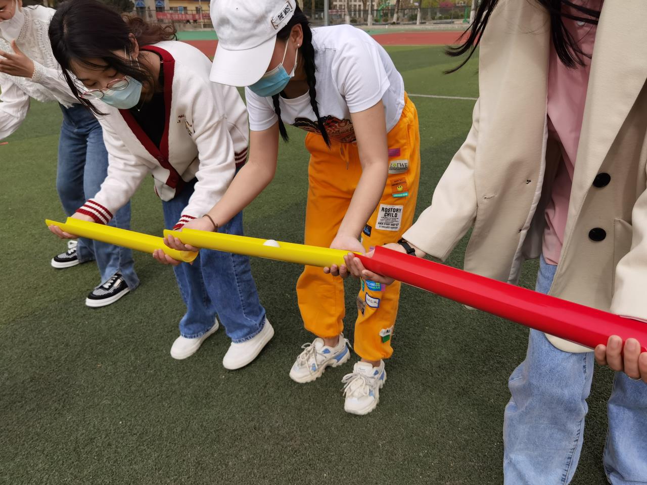 本次活动内容主要包括“无间道”“无敌风火轮”“不倒森林”“多人多足”“众人击鼓”五个团体项目,到场的同学以9至12人一组进行团体项目的竞技角逐。在“无间道”活动中,队员们将手中的pvc管连接在一起形成管道,乒乓球在同学间经过管道快速传递。在“无敌风火轮”项目中,队员们紧密地排成一列站在一个圆形传送带上,齐喊着口号步伐一致地向前走,带动“风火轮”不断滚动。活动中,同学们动作整齐划一,配合非常默契,现场氛围既激烈又欢快。