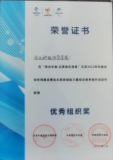 近日,北京冬奥组委志愿者部、北京团市委、河北团省委共同对“奔向冬奥 志愿者在准备”赛会志愿者储备力量综合素养提升活动进行表彰,我校在此项活动中综合得分位居河北省志愿者来源高校第一名,被授予“优秀组织奖”。
