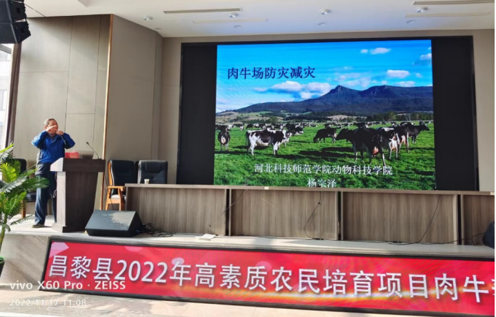 河北省昌黎县肉牛养殖已经形成了一定规模,为帮助养殖基地和养殖大户解决生产过程中遇到的关键技术问题,增强市场竞争力,提高经济效益。近日,河北肉牛产业创新团队疫病防控岗位专家及成员史秋梅教授、杨宗泽教授应河北省昌黎县农业农村局邀请,为昌黎县2022年高素质农民培育项目肉牛养殖培训(一)班,开展了关于“肉牛常见病及防控、肉牛场防灾减灾”方面的技术培训。50余名专业技术人员、养殖基地负责人和养殖大户等参加了技术培训活动。培训活动还赠送了50本相关的培训学习用教材资料。