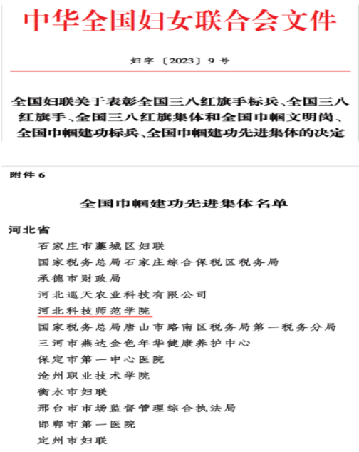 大会表彰了10名全国三八红旗手标兵、298名全国三八红旗手、199个全国三八红旗集体、996名全国巾帼建功标兵、1992个全国巾帼文明岗、500个全国巾帼建功先进集体,我校荣获“全国巾帼建功先进集体”称号。大会向广大妇女发出“巾帼心向党 奋进新征程”的倡议,激励广大妇女坚定不移听党话、跟党奋进新征程,豪情满怀、意气奋发投入推进中国式现代化的伟大实践。(编辑:孙艳敏 审核:赵宗宝)