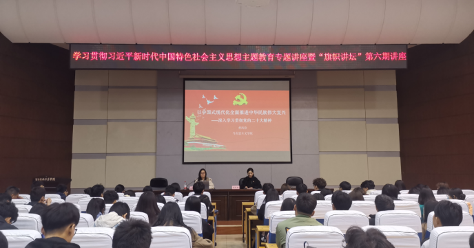2023年4月20日下午,“学习贯彻习近平新时代中国特色社会主义思想主题教育暨旗帜讲坛第六期”专题讲座在秦皇岛校区学术报告厅举行,我校教师代表、秦皇岛校区各学院学生代表近300人现场聆听讲座。