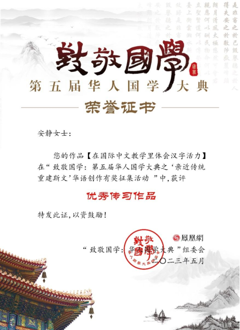 近日,由凤凰网主办的“致敬国学:第五届华人国学大典”活动圆满落幕。5月4日,组委会公布了本届华人国学大典的子项目 “亲近传统 重建斯文”华语创作有奖征集活动的获奖作品名单。有18件作品荣膺“最佳研究作品”、“最佳传习作品”和“最佳才情作品”,22件作品获评“优秀研究作品”、“优秀传习作品”和“优秀才情作品”。其中,我校文法学院教师安静的作品《在国际中文教学里体会汉字活力》获得“优秀传习作品”。