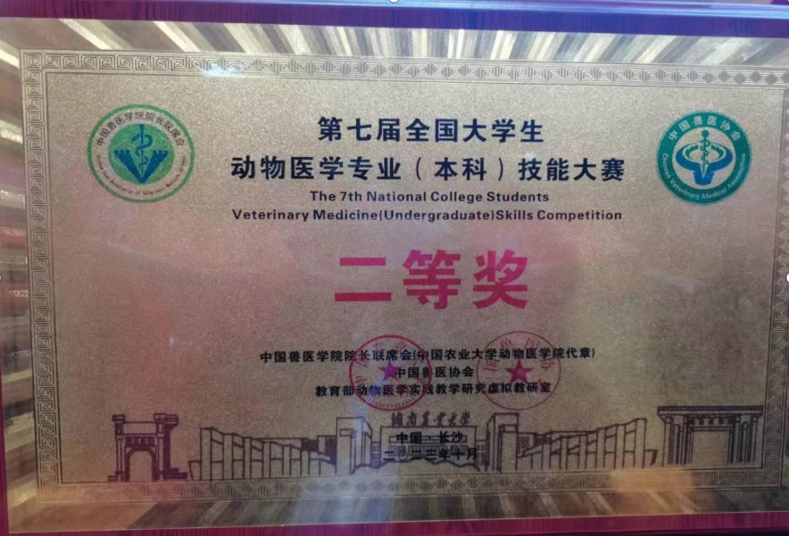 2023年10月21日至24日,第七届全国大学生动物医学专业技能大赛在长沙举行。我校动物科技学院2021级动物医学专业卢美、刘柯、刘芯悦、康欣雨、赵嘉睿等五名同学组成的代表队参加比赛并荣获大赛团体二等奖。大赛由谢相悦、杨姗姗、吴同垒、刘永波、马增军等五位专业教师担任指导老师。