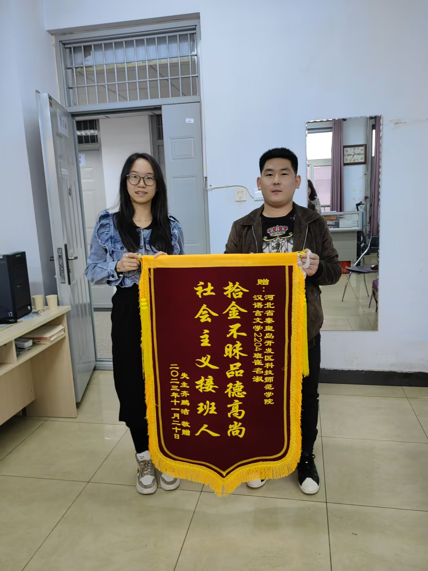 2023年11月20日,河北省廊坊市廊大集团员工齐某专程从廊坊来到我校,送来感谢信、锦旗及条幅,表达了对我校文法学院崔名淑同学拾金不昧行为的诚挚感谢和对学校的敬意。