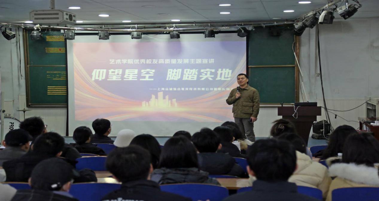 艺术学院举办优秀校友宣讲活动。上海众诚皆合教育投资有限公司董事长韩玉龙校友为艺术学院师生作“仰望星空,脚踏实地”主题宣讲。宣讲会上,韩玉龙校友回忆分享了在校期间的学习经历,从学习目标、人际关系、创业经历和感恩等方面,结合自己的经历和感悟指导同学们树立正确的就业观和创业精神。他勉励学弟学妹们要加强自我管理,不断提升自我,保持一颗善良的心,争做一个骄傲的科师人。