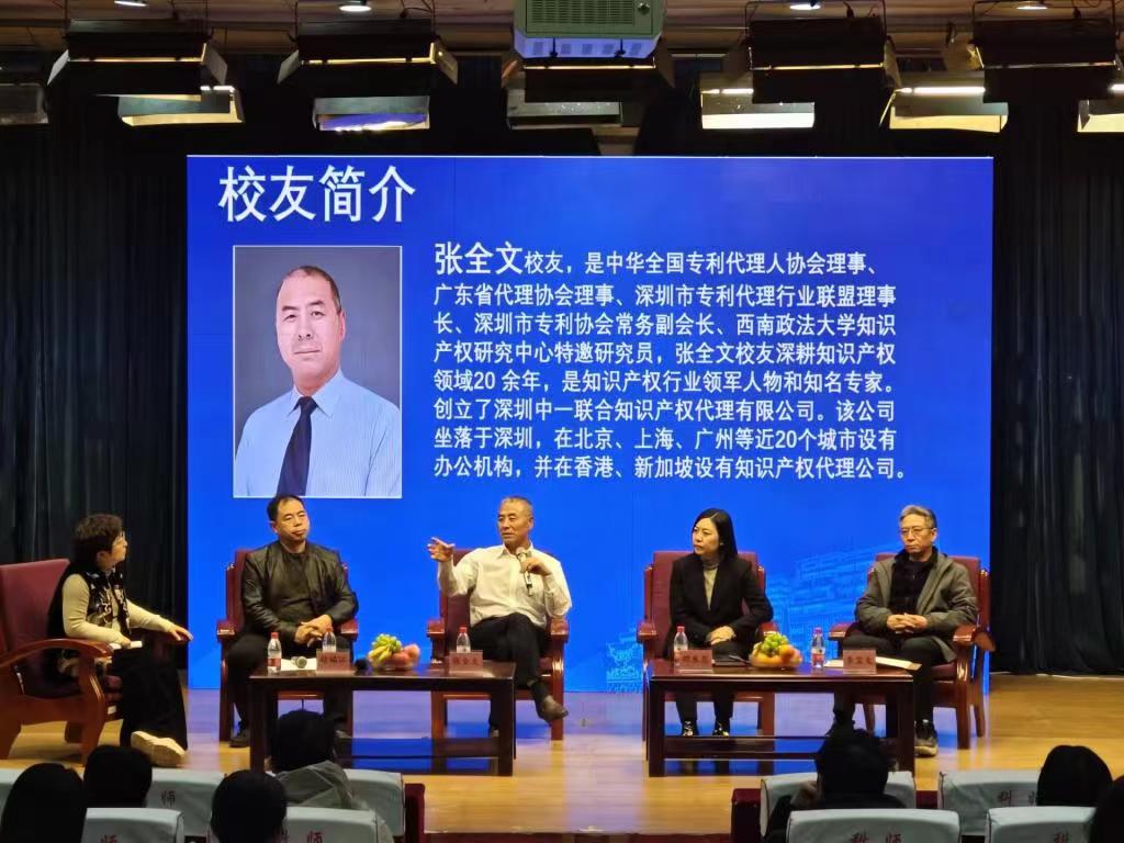 文法学院召开高质量发展恳谈会文法学院分论坛。深圳中一联合知识产权代理有限公司董事长张全文校友与同学们分享了自己的学习工作经历,与同学们交流了知识产权相关问题,他表示,知识产权企业在中国发展蒸蒸日上,知识产权在中国的发展前景一片光明,激励广大同学踔厉奋发、努力拼搏。他强调,知识产权领域是社会进步与国家发展的关键一环,而我国现如今在这方面面临着专业人才缺少的问题,要拓宽知识产权发展道路,就必须大力培养专业人才,知识产权专业学生要珍惜在校时间,努力学习专业知识并提高自身的专业素养,力争成为一名全面发展的新时代行业人才。同时,张全文也谈到了相关专业毕业生就业问题,他指出,在知识产权行业向好的社会大背景下,同学们要以德为先,先做人再做事,踏踏实实,不断提升专业能力,为知识产权行业的发展贡献出自己的一份力量。在互动环节中,张全文细心地为同学们答疑解惑,从国际和我国知识产权行业现状、个人经历、个人见解等方面对同学们提出的问题进行讲解,为同学们指明了未来的发展方向。