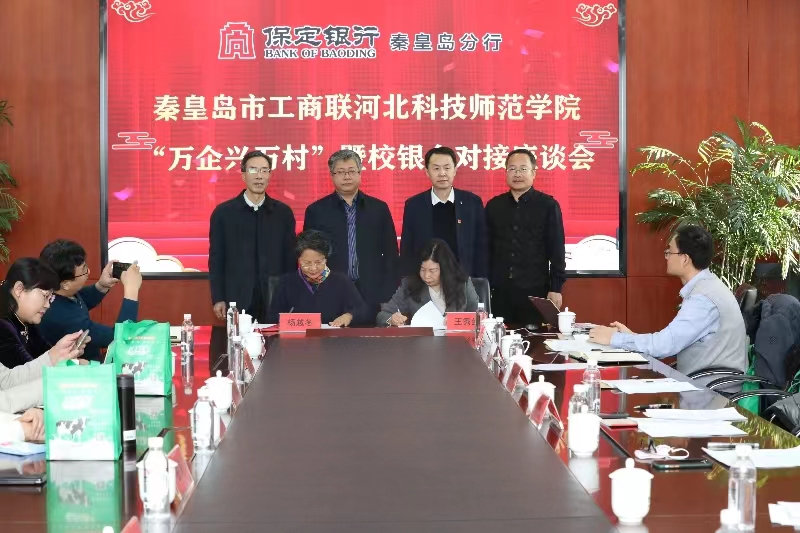 2023年12月12日,我校与秦皇岛市工商业联合会在保定银行秦皇岛分行会议室举办“万企兴万村”校银企对接座谈会,并签署了战略合作协议。副校长杨越冬,秦皇岛市工商联主席王秀红,秦皇岛市工商联三级调研员林荣忱,秦皇岛市工商联经济联络处处长高宝奇,保定银行秦皇岛分行副行长李哲然,秦皇岛市十家企业代表出席了签约仪式。我校乡村振兴研究中心负责人及相关专家参加活动。