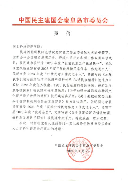 日前,中国民主建国会秦皇岛市委员会向我校发来贺信,感谢学校党委一直以来对民建市委工作的大力支持和帮助。贺信表示,民建华体买球支部全体会员积极履职尽责,经过共同努力各项工作取得丰硕成果,被民建市委评为2023年度“社情民意工作先进集体”。(编辑:孙艳敏 审核:王荣加)