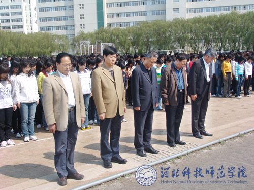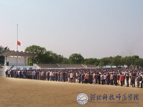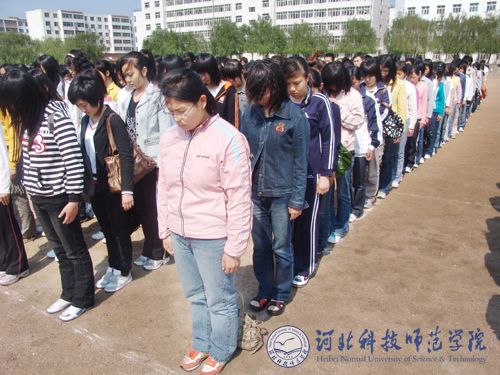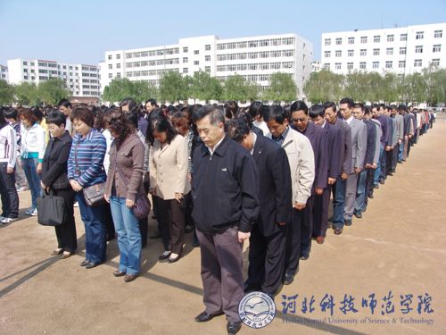 2008年5月19日下午,我校全体师生隆重举行“向四川地震遇难同胞默哀”仪式。默哀仪式分别在我校秦皇岛校区、昌黎校区、开发区校区和欧美学院校区同时举行。学校党政领导石千峰、汤生玲、陈继生、王同坤、宋绍富、孟令臣、房海、刘泽义、杨洪青及全校师生共24000余人于14时28分在悠远的气笛哀鸣声中垂首肃立,向四川地震遇难同胞默哀三分钟。